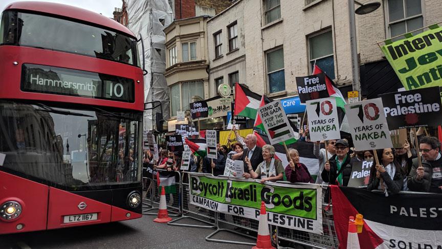 İngiltere'nin başkenti Londra'da gerçekleşen Büyük Dönüş Yürüyüşü'ne destek gösterisinde İsrail'in kuruluşu olan Nekbe'nin 70. yılı protesto edildi.