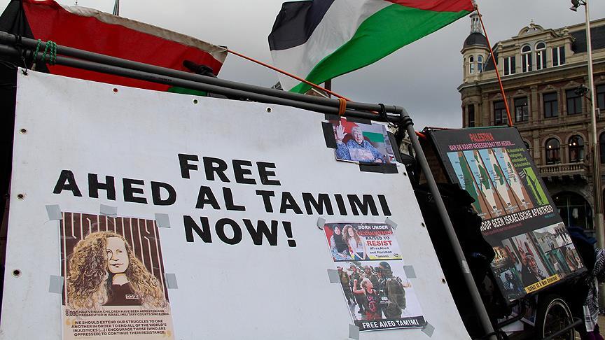 Hollanda'nın başkenti Amsterdam'da İsrail'in tutuklu yargıladığı "Hanzala Cesaret Ödülü" sahibi Filistinli Ahed et-Temimi'ye destek gösterisi düzenlendi.