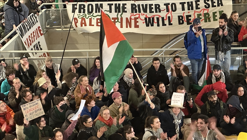Başkent Amsterdam'daki merkezi tren istasyonunda yerel saatle 18:00'de toplanan göstericiler, "Özgür Filistin" ve "Nehirden denize özgür Filistin" sloganları attı.