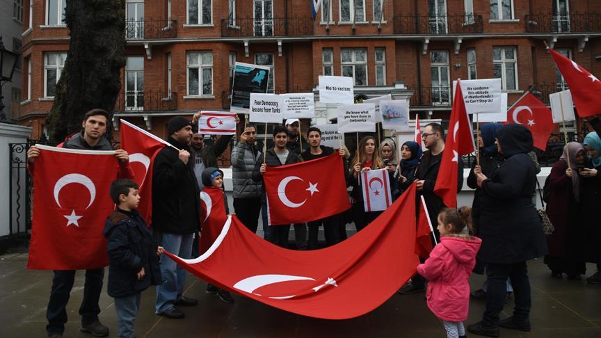 Hollanda’nın, Dışişleri Bakanı Mevlüt Çavuşoğlu ile Aile ve Sosyal Politikalar Bakanı Fatma Betül Sayan Kaya'ya yönelik skandal tavrı ile Hollanda polisinin Türk vatandaşlarına yönelik şiddeti Londra’da protesto edildi.