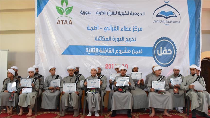 Türkiye sınırı yakınlarındaki Ataa köyünde, Kur'an-ı Kerim eğitimini bitiren 13 ila 35 yaşlarındaki 26 öğrenci için gerçekleştirilen tören, Kur'an tilaveti ve ilahilerin okunmasıyla başladı.