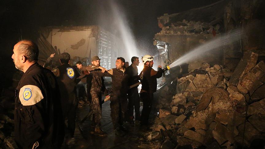Suriye'nin İdlib gerginliği azaltma bölgesi sınırları içinde yer alan Harem ilçesindeki bir pazar yerine düzenlenen hava saldırısında ilk belirlemelere göre 28 sivil yaşamını yitirdi. Saldırı sonrası bölgeye gelen sivil savunma ekipleri, çıkan yangına müdahale etti. ( Ahmed Rahhal - Anadolu Ajansı )