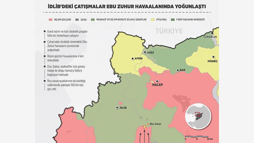 Geçen ekim ayında, Rus hava kuvvetlerinin desteğiyle İdlib gerginliği azaltma bölgesine saldırı başlatan rejim ordusu ve İran kontrolündeki yabancı gruplar, dün akşam Ebu Zuhur beldesindeki askeri havaalanının 1 kilometre yakınına ulaştı.
