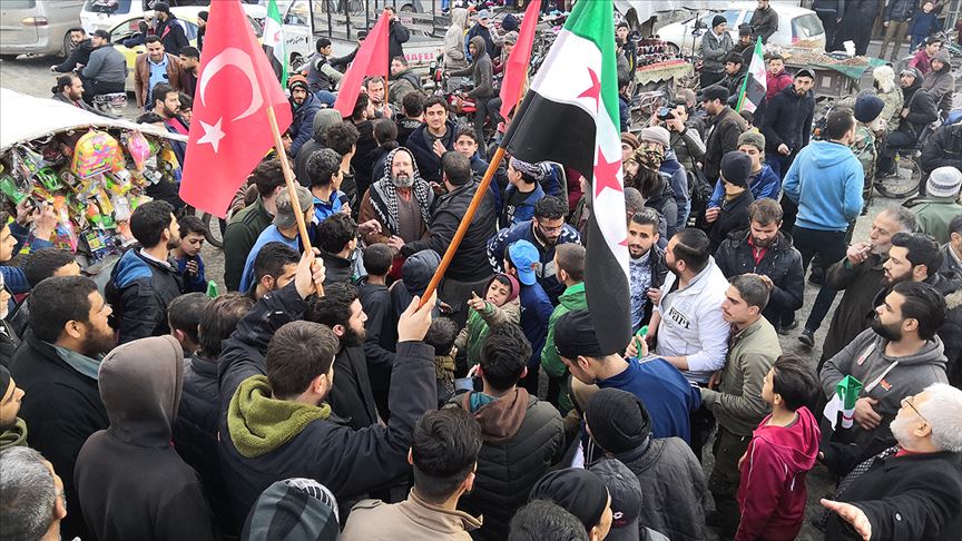 Rejim karşıtı sloganlar atan grup, Astana anlaşması ve Soçi mutabakatı gereği İdlib'de bulunan Türkiye'ye başsağlığı dileklerini yenileyerek, teşekkür etti.