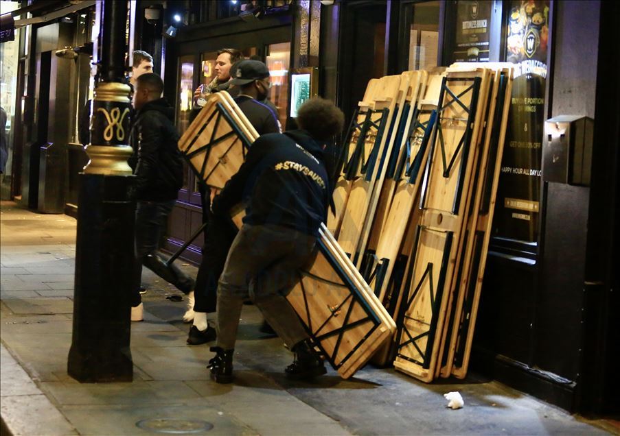 İngiltere’de yeni tip koronavirüsle (Kovid-19) mücadele kapsamında alınan karantina kararıyla beraber bar, restoran ve temel ihtiyaç malzemeleri satmayan tüm işletmeler kapatıldı. Barların kapatılmasının ardından başkent Londra'da gençler sokaklarda eğlenmeye devam etti. Polis ekipleri, çevrede önlem aldı. ( Hasan Esen - Anadolu Ajansı )