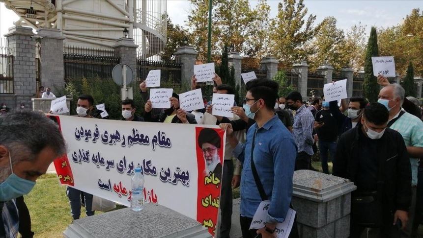Ülke lideri Ali Hamaney'in "Yatırım için en iyi yer finans piyasasıdır." sözlerinin yazılı olduğu pankartları taşıyan onlarca kişi meclis binası önünde, İran Menkul Kıymetler Borsası'nda son günlerde yaşanan düşüşe tepki gösterdiler.