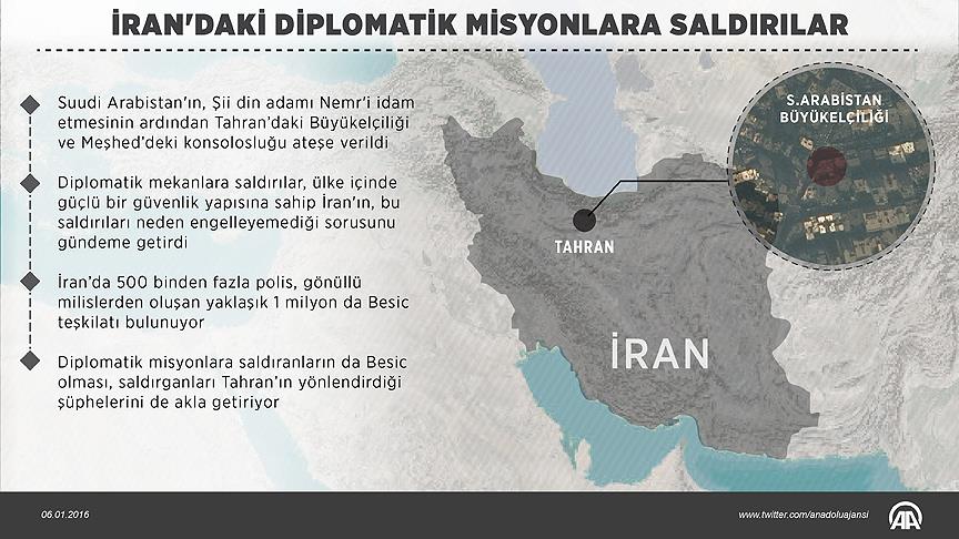 Suudi Arabistan'ın diplomatik misyonlarına saldırılması Tahran yönetiminin diplomatların ve büyükelçiliklerin korunmasını güvence altına alan Viyana Sözleşmesi'ni ihlalindeki sicilini hatırlattı.