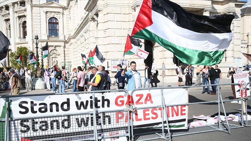 Avusturya polisinin geniş güvenlik önlemleri nedeniyle parlamento binasına 300 metre uzaklıktaki Şehir Tiyatrosu önünde toplanan Filistin destekçileri, Filistin bayraklarının yanı sıra "Soykırıma hayır", "Özgür Gazze", "Savaş suçlusu Netanyahu" yazılı pankartlar açtı.