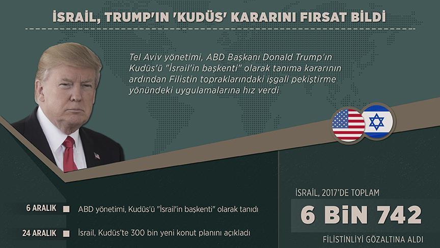 Tel Aviv yönetimi, ABD Başkanı Donald Trump'ın Kudüs'ü "İsrail'in başkenti" olarak tanıma kararının ardından Filistin topraklarındaki işgali pekiştirme yönündeki uygulamalarına hız verdi.