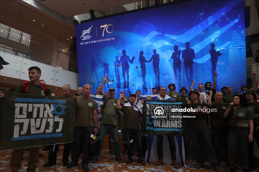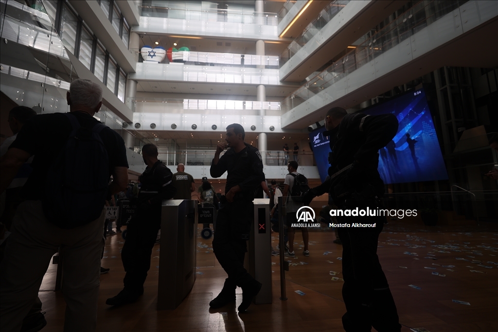 Bir grup gösterici, Ramat Gan'daki Tel Aviv Borsa binasına girerek "Ekonomiyi kurtarın" yazılı pankart açtı, aynı mesajın yazılı olduğu yüzlerce sahte banknotu yere attı.