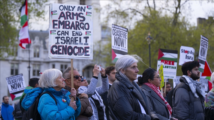 Filistin'le dayanışma gösteren sivil toplum kuruluşlarının çağrısıyla toplanan yüzlerce kişi İngiltere Parlamentosu önündeki Parlamento Meydanı'nda bir araya geldi.