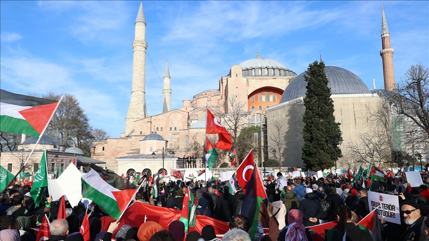 Eyleme katılanlar, İsrail'i protesto edip Filistin'e destek veren dövizler taşıyarak sloganlar attı. Kalabalık daha sonra Ayasofya-i Kebir Cami-i Şerifi'ne yürüdü. Burada Kur'an-ı Kerim ve dualar okundu.