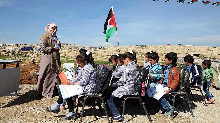 Fransa hükümetinin desteğiyle geçen sene inşa edilen "Ebu Nevvar" bölgedeki tek okul olmasına rağmen İsrail askerleri tarafından buldozerlerle yıkıldı, ancak İsrail'in okulsuz bıraktığı öğrenciler, eğitimden vazgeçmedi. Soğuk havaya aldırmaksızın, açık alana kurulan dersliği dolduran öğrenciler, ders görmeye devam ediyor.
