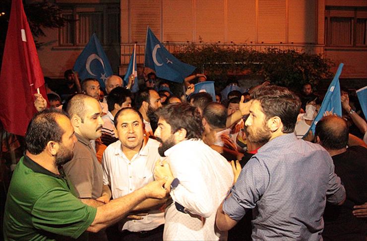 Şişli Zincirlikuyu'daki başkonsolosluğun da yer aldığı binanın önünde toplanan gruptakiler, "Yaşasın özgür Doğu Türkistan", "Türkiye uyuma kardeşine sahip çık" sloganları attı.