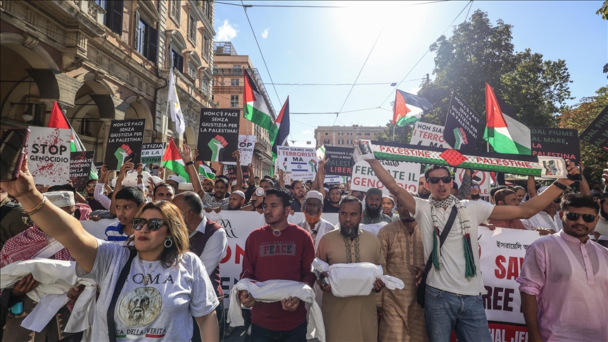 İtalya'nın başkenti Roma'nın işlek meydanlarından Vittorio'da buluşan Müslümanlar, önce Cuma namazını kıldı ve Filistin için dua etti.