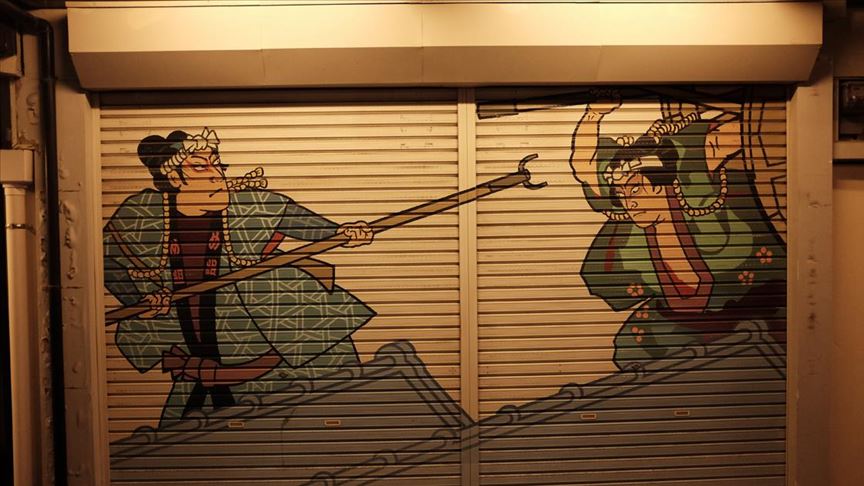 Japonya'nın başkenti Tokyo'da yoğun ziyaretçi çeken Asakusa bölgesinde, Japon tarihi ve kültürünü yansıtan birbirinden farklı modern ve geleneksel çizimler dükkan kepenklerini süslüyor.