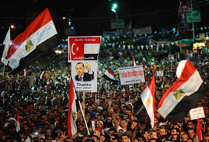 Başkent Kahire'nin doğusundaki Rabiatu'l Adeviyye meydanında bir araya gelen göstericiler, ülkenin seçilmiş ilk Cumhurbaşkanı Muhammed Mursi'nin serbest bırakılması ve göreve iadesi için düzenlediği gösteride, Mısır'daki askeri darbeye yönelik tutumu ve demokrasi yanlılarına verdiği destekten dolayı Erdoğan'a destek sloganları attı.
