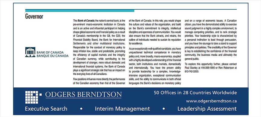 İlanda. Merkez Bankası'nın Kanadalıların hayatında stratejik rol oynadığı hatırlatılarak, ''Başkan'ın güvenilirliği, finans çevreleri, iş dünyası ve genel olarak toplumun güvenini kuran anahtardır'' ifadelerine yer veriliyor.