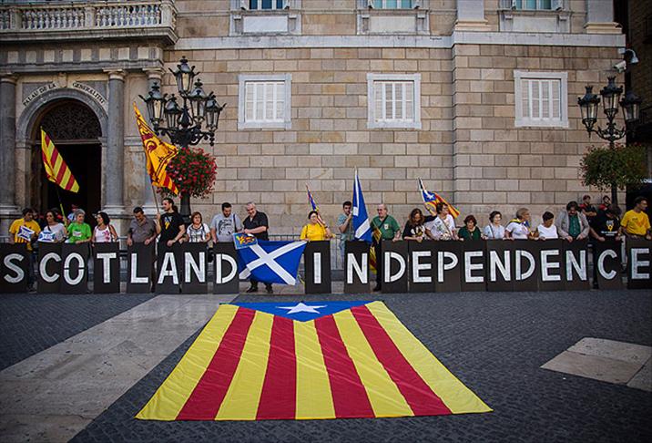 Barcelona'daki Katalonya Özerk Yönetim Hükümet Başkanlığı Konutu (Generalitat) önünde toplanan "İskoçya'da evet'e dayanışma grubu" üyeleri, "Bağımsızlık" ve "İngiltere bir demokrasi, İspanya değil" şeklinde slogan attı.