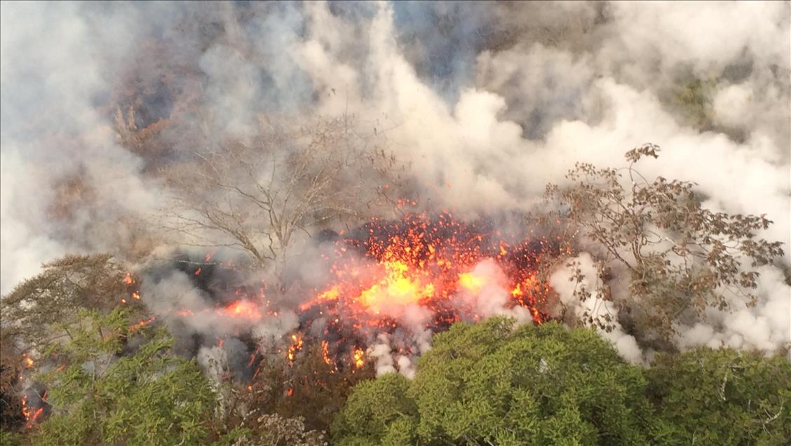 ABD'nin Hawaii eyaletinde geçen hafta faaliyete geçen Kilauea Yanardağı'nda yeni bir patlama meydana geldi. Yanardağdan 61 metreye kadar püsküren lav, 36 bin metrekarelik alana yayıldı. Lav akışının ne kadar daha süreceği bilinmiyor. Volkanın yerde oluşturduğu çatlaklardan erimiş kaya, zehirli gaz ve buhar çıkmaya devam ediyor. ( Handout / USGS - Anadolu Ajansı )