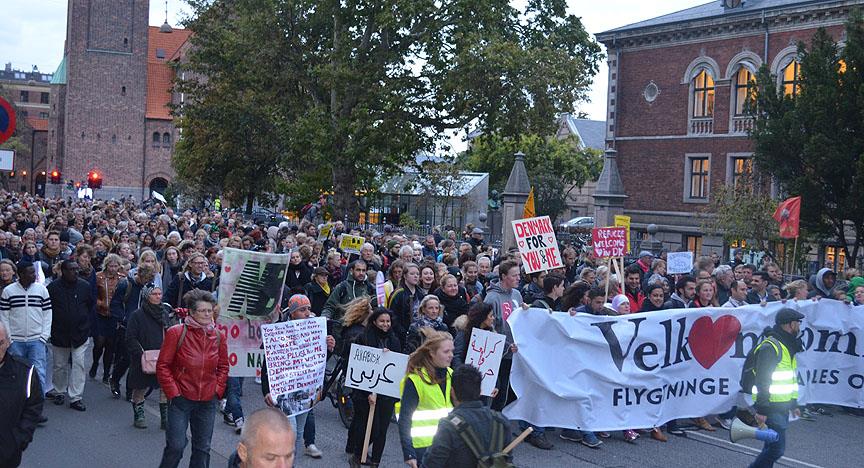 Yürüyüşe katılanlar zaman zaman, "Herkese hemen şimdi iltica", "Mülteciler hoşgeldiniz", "Sokaklarımızda ırkçı istemiyoruz" gibi sloganlar attı. Kalabalık nedeniyle Kopenhag merkezinde bazı yollarda trafik akışı dururken, polisin aldığı güvenlik önlemleri dikkat çekti.