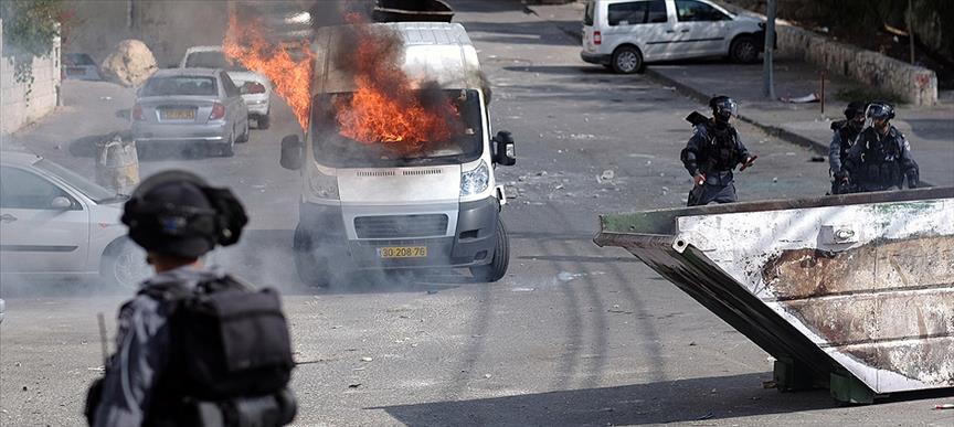 Sokaklarda barikat kuran ve "İntifada" sloganları atan göstericilerin, bir minibüsü de ateşe verdiği görüldü.