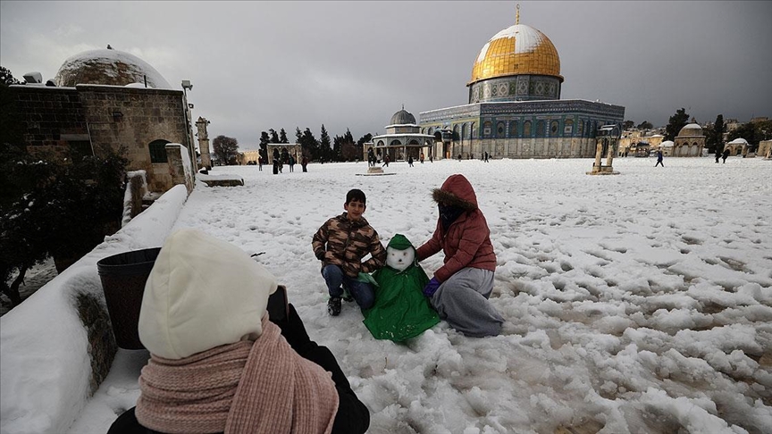 Karın nadiren yağdığı ve uzun sürmediği bölgede, şehrin beyaza bürünmesini fırsat bilen Kudüslüler Mescid-i Aksa'da toplanarak kartopu oynadı.