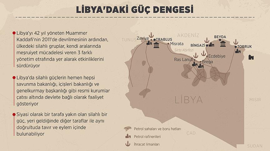 Libya'yı 42 yıl yöneten Muammer Kaddafi'nin 2011'de devrilmesiyle yeni bir döneme giren ülkedeki silahlı gruplar, kendi aralarında meşruiyet mücadelesi veren 3 farklı yönetim etrafında yer alarak etkinliklerini sürdürüyor.