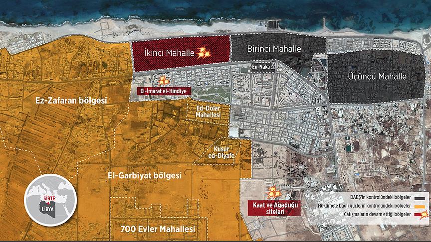 Terör örgütü DAEŞ, Sirte'deki kalesi sayılan Kaat, Ağaduğu, İkinci Mahalle ve El-İmarat el-Hindiye'de ise güvenlik güçlerine şiddetli çatışmalarla direnmeye çalışırken, kentin merkezindeki 3 mahallenin yanı sıra Birinci ve Üçüncü mahalleleri de elinde tutuyor.