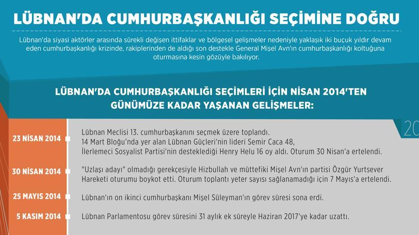 Lübnan'da siyasi aktörler arasında sürekli değişen ittifaklar ve bölgesel gelişmeler nedeniyle yaklaşık iki buçuk yıldır devam eden cumhurbaşkanlığı krizinde, rakiplerinden de aldığı son destekle General Mişel Avn'ın cumhurbaşkanlığı koltuğuna oturmasına kesin gözüyle bakılıyor.