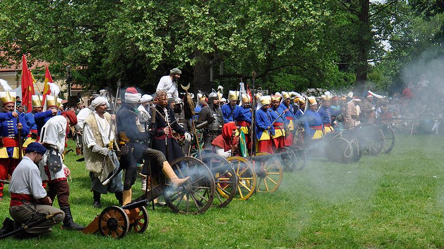 Macaristan'ın kuzeybatısındaki Tata (Gölbaşı) şehrinde gerçekleşen festivalde Macar ve Osmanlı askerlerinin kıyafetiyle temsili savaş canlandırıldı.