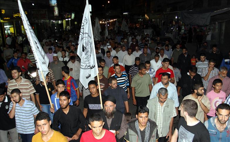 Hamas'ın çağrısı üzerine Han Yunus'ta yürüyüş düzenleyen Filistinliler, "Aksa'ya ruhumuz feda" yazılı pankart ve bayraklar taşıyarak İsrail aleyhine sloganlar attı.