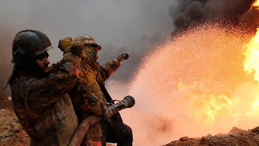 DEAŞ militanlarının bölgeyi terk ettikleri esnada patlayıcılarla imha ettikleri petrol kuyuları, itfaiye ekiplerinin gerçekleştirdiği yangın söndürme çalışmaları ile kontrol altına alınmaya çalışılıyor.