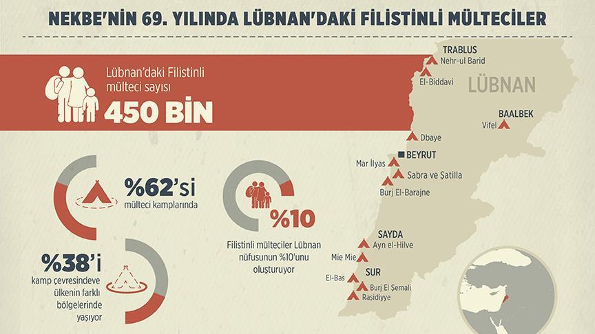 Resmi rakamlara göre, Birleşmiş Milletlere (BM) kayıtlı 450 bin civarında Filistinli mülteci Lübnan'da yaşıyor. Lübnan nüfusunun yaklaşık yüzde 10'unu oluşturan bu mültecilerin yarısından fazlası (yüzde 62), altyapı ve sosyal imkanların çok kısıtlı olduğu 12 mülteci kampında yaşarken geri kalanlar ise kamp çevresinde ve ülkenin farklı bölgelerinde ikamet ediyor.