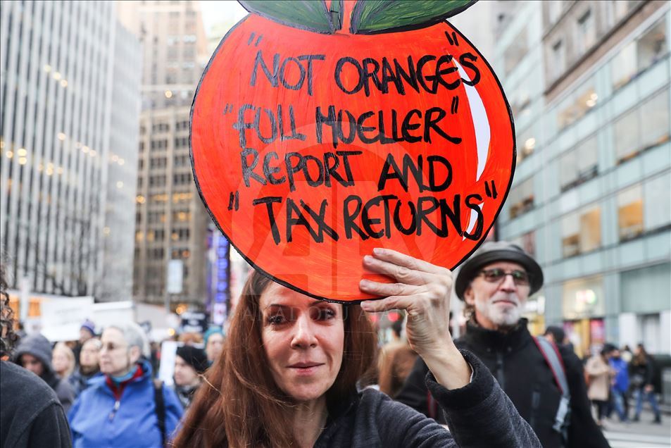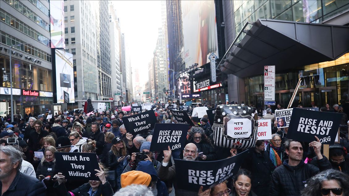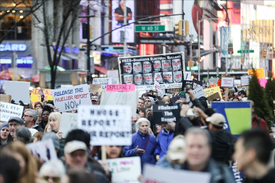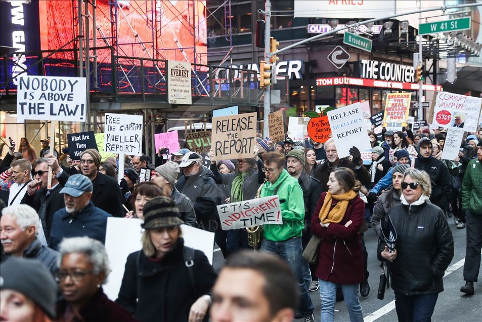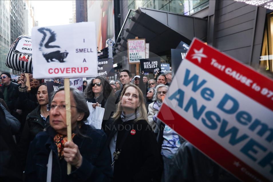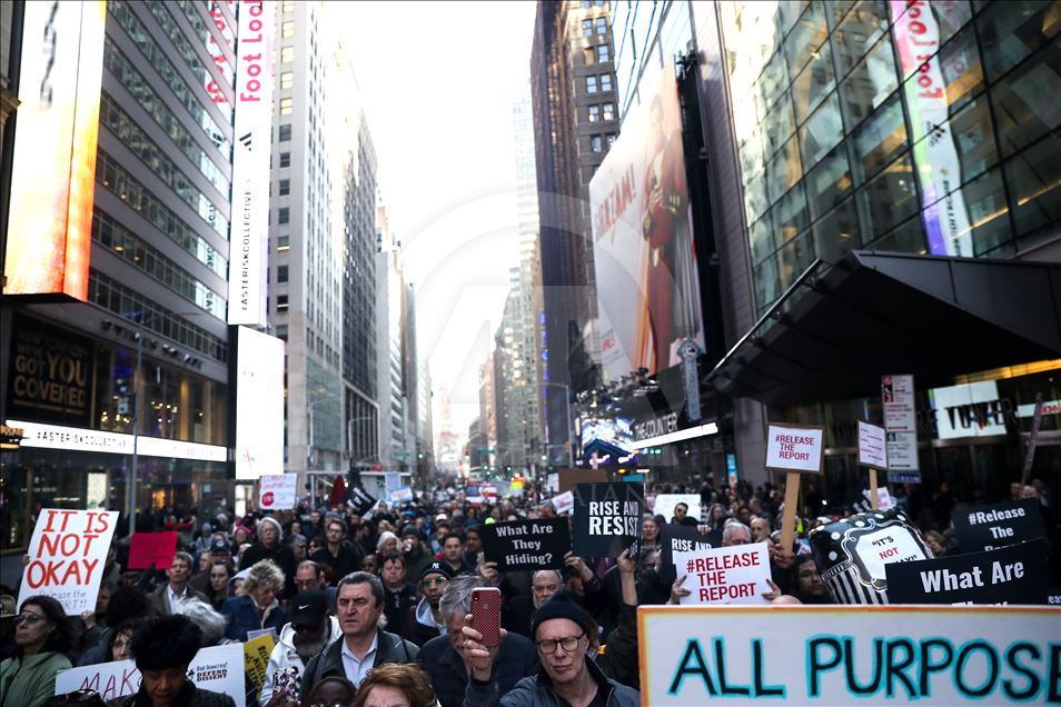 New York'ta, özel savcı Robert Mueller’in hazırlayıp Adalet Bakanlığına sunduğu Rusya soruşturması raporunun tamamının açıklanması için protesto gösterisi düzenlendi. ( Atılgan Özdil - Anadolu Ajansı )