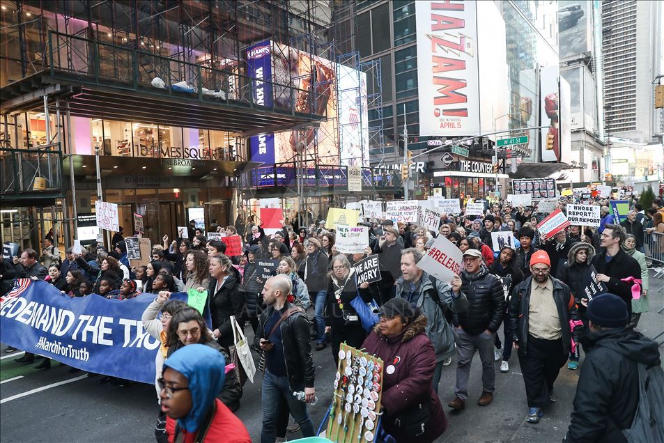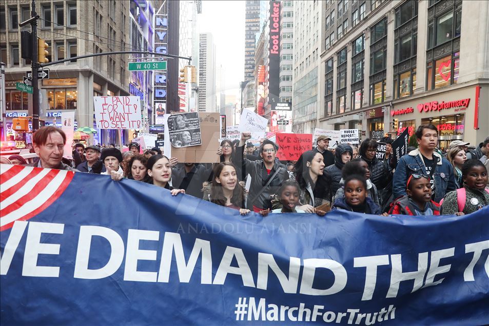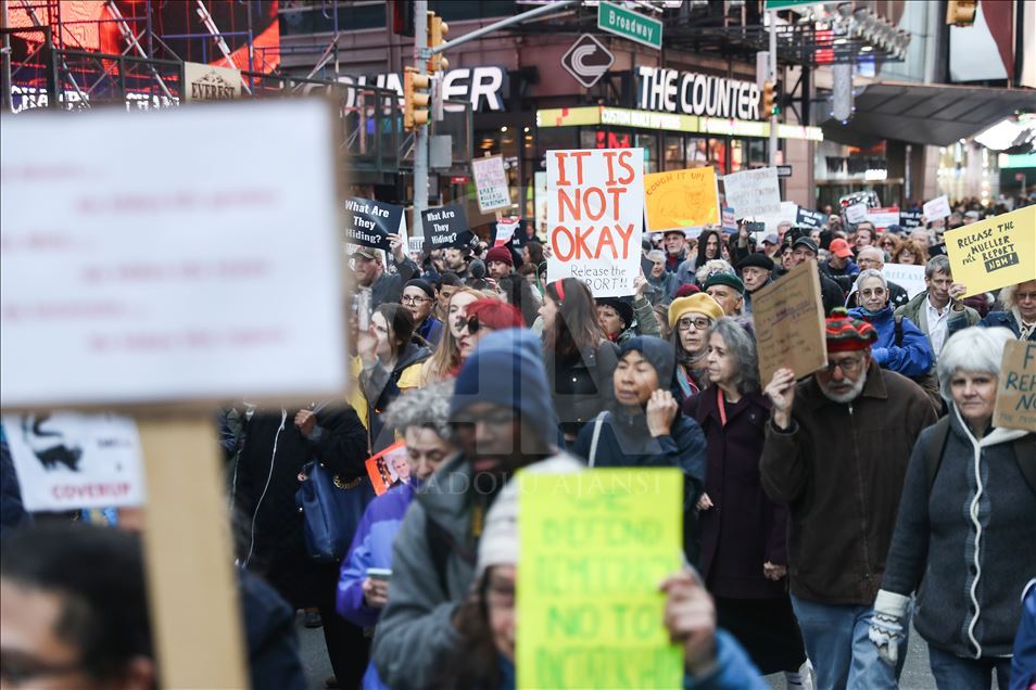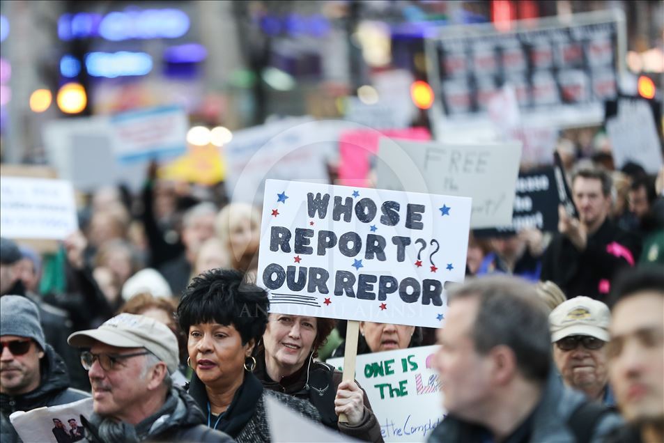 Raporun tamamının kamuoyu ile paylaşılması için yürüyen göstericiler, "Halkın gerçeği görmesi amacıyla Mueller raporunun tamamının açıklanmasını" talep etti.
