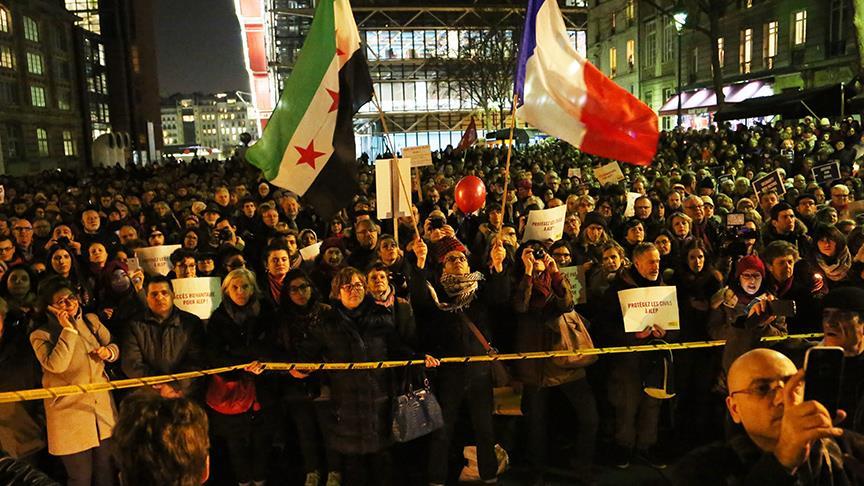 Suriye'nin Halep kentinin doğusunda kuşatma altındaki sivil halka yönelik saldırılar, Fransa'nın başkenti Paris'te protesto edildi.