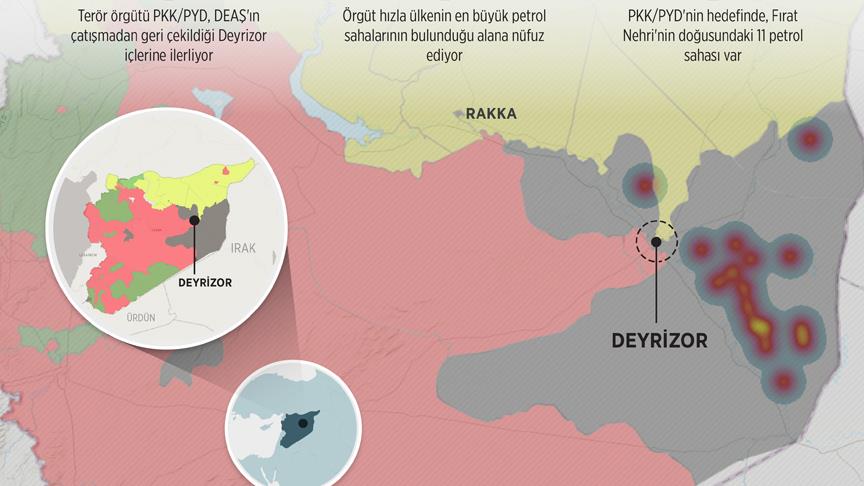 PKK/PYD'nin operasyon alanının, Deyrizor ilinin Irak sınır hattında, Fırat Nehri doğusunda kalan petrol sahalarını da içermesi dikkati çekiyor.