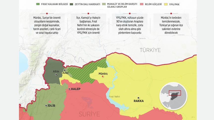 AA'nın derlediği bilgilere göre, Halep'in doğusundaki Münbiç ilçesi, Fırat Nehri’ne 35, Türkiye sınırına 40 kilometre uzaklıkta yer alıyor.