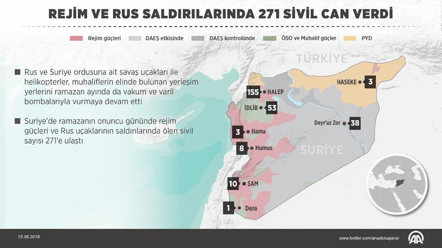 AA muhabirinin sivil savunma kuruluşları ve Şam Belgelendirme Merkezi'nden aldığı bilgiye göre, ramazanın onuncu gününde Şam, Dareyya, Doğu Guta, Halep, İdlib, Deyr'uz Zor ve Dera'da düzenlenen saldırılarda hayatını kaybedenlerin sayısı 17'si çocuk, 14'ü kadın 271'e ulaştı. Saldırılarda yüzlerce kişi de yaralandı.