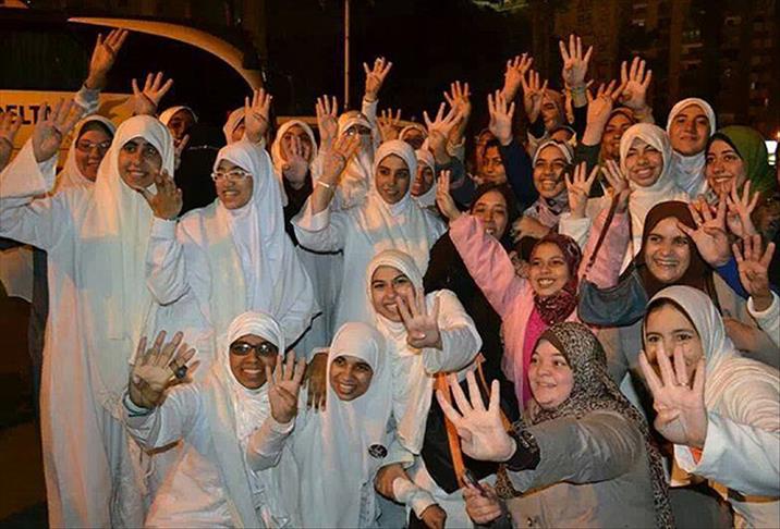 İskenderiye yakınlarındaki El-Buhayra kentindeki El-Ebadiye Hapishanesi'nden çıkışlarında yakınları ve arkadaşları tarafından karşılanan 21 kız Rabia işareti yaptı.