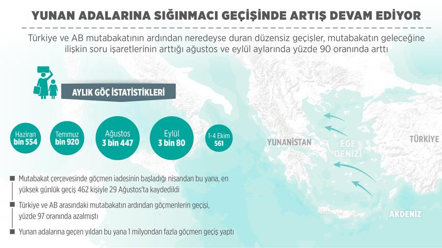 AA muhabirinin Birleşmiş Milletler Mülteciler Yüksek Komiserliği (BMMYK) ve Yunanistan resmi makamlarından derlediği bilgilere göre, Türkiye ve Avrupa Birliği (AB) mutabakatının ardından neredeyse durma noktasına gelen düzensiz geçişler, mutabakatın geleceğine ilişkin soru işaretlerinin arttığı ağustos ve eylül aylarında yüzde 88 oranında arttı.