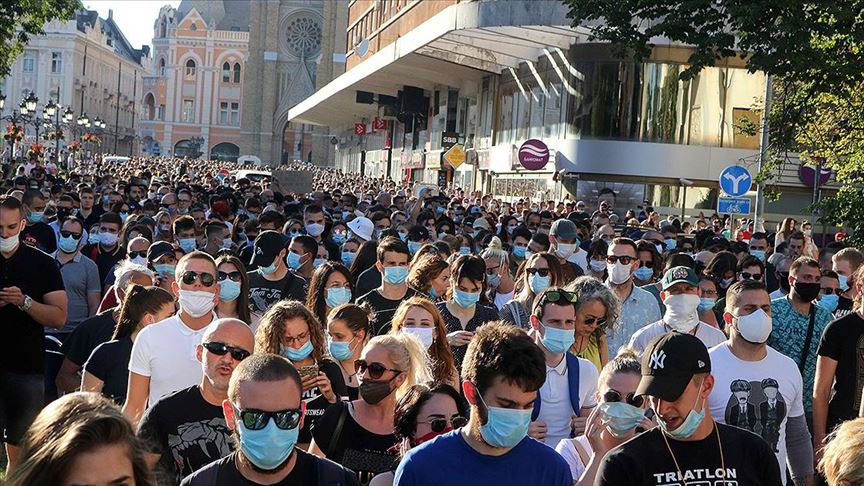 Vucic'in ülkedeki Kovid-19 vakalarının yeniden artması üzerine Belgrad'da hafta sonu boyunca sokağa çıkma yasağı uygulanacağını açıklamasının ardından binlerce insan salı akşamı başkent Belgrad'daki meclis binası önünde toplanarak kararı protesto etmişti.