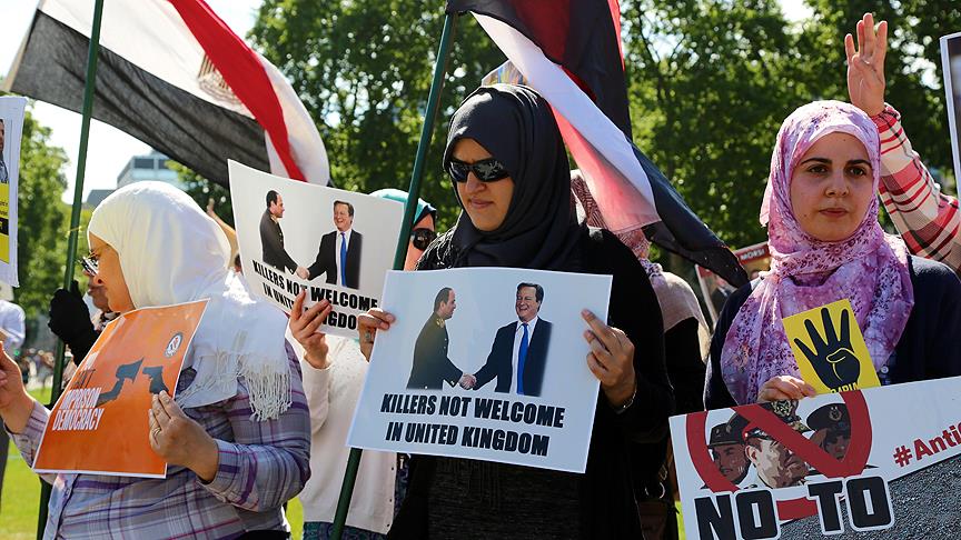 Bu arada, Sisi'nin İngiliz hükümeti tarafından ülkeye davet edilmesi, İngiltere'nin başkenti Londra'da protesto edildi. Britanya Müslüman Birliği (MAB) ile "Demokrasi için İngiltere'deki Mısırlılar" adlı grup tarafından düzenlenen gösteride, tarihi İngiliz Parlamentosu önünde bir araya gelen grup, İngiliz hükümetinin Sisi'yi Londra'ya davet etmesine tepki gösterdi. Grup, İngiltere Başbakanı David Cameron'a, Mısır'daki askeri yönetime destek vermeyi sonlandırması çağrısında bulundu.