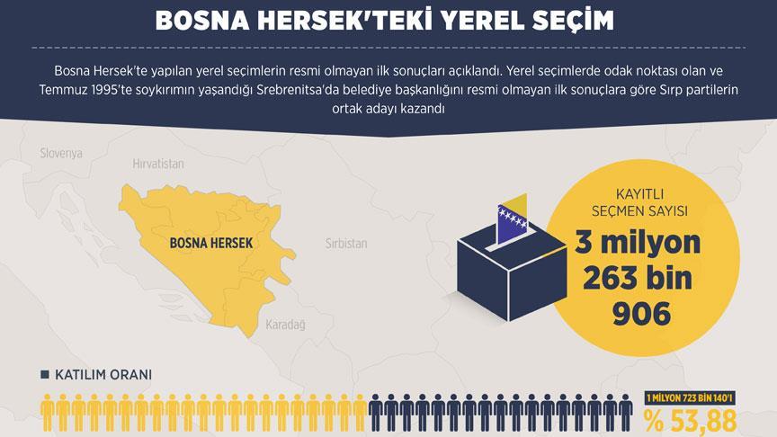 Bosna Hersek Merkez Seçim Kurulu (CIK) Başkanı Ahmet Santic, düzenlediği basın toplantısında, resmi olmayan ilk sonuçlara göre Demokratik Eylem Partisi (SDA) ve Daha İyi Gelecek İçin İşbirliği (SBB) koalisyonu 34, Bağımsız Sosyal Demokratlar Birliği (SNSD) 26, Hırvat Demokrat Birliği Bosna-Hersek (HDZ BiH) 18 ve Sosyal Demokrat Partisi'nin (SDP) 8 belediyeyi kazandığını bildirdi.