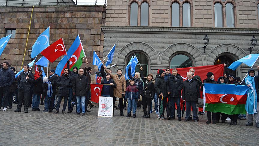 İsveç'in başkenti Stockholm'de parlamento önünde bir araya gelen İsveç Türkmeneli Federasyonu üyeleri, Rus ve Suriye rejim güçlerinin Türkmendağı'na yönelik saldırılarını protesto etti.
