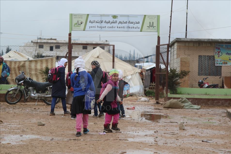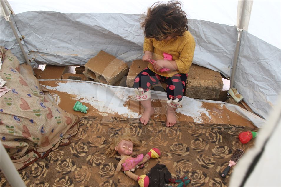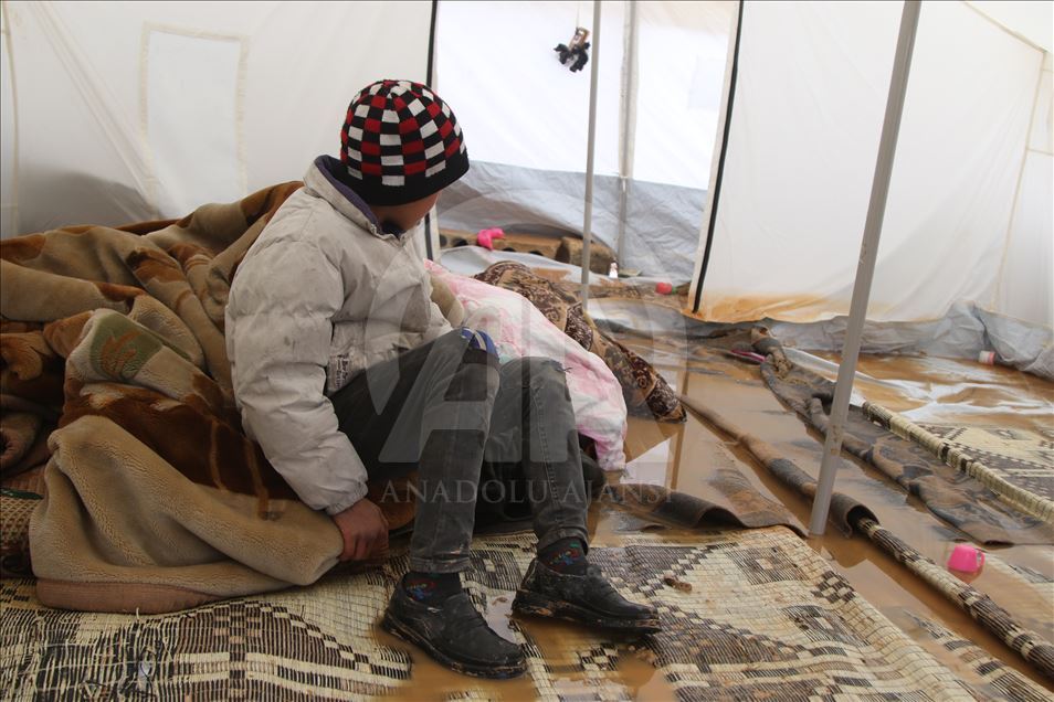 İdilb'de Türkiye sınır hattında zorla yerinden edilmiş sivillerin sığındığı çadır kentlerde şiddetli yağışlar yüzünden yüzlerce çadır su ve çamur birikintisi altında kaldı.