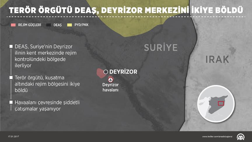 Suriye'nin güneydoğusunda Irak sınırındaki Deyrizor'daki AA muhabirlerinin bildirdiğine göre, terör örgütü DEAŞ, kuşatma altında tuttuğu kent merkezindeki rejim güçlerine karşı dün gece şiddetli saldırı başlattı.