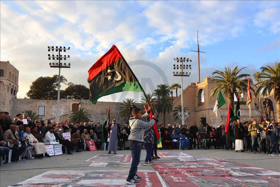 Libya bayrağının yanı sıra Türkiye ve Tunus bayraklarının da taşındığı meydanda eylemciler, Hafter milislerine karşı Trablus'u savunan ülkenin meşru temsilcisi Ulusal Mutabakat Hükümeti'ne (UMH) bağlı güçlere destek sloganları attı.