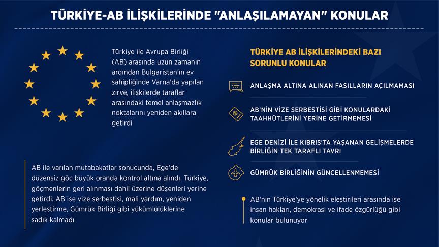 Özellikle son dönemde anlaşma altına alınan fasılların açılmaması, AB'nin vize serbestisi gibi konulardaki taahhütlerini yerine getirmemesi ve Ege Denizi ile Kıbrıs'ta yaşanan gelişmelerde birliğin tek taraflı tavrı, ilişkilerdeki sorunlu konuların başında geliyor.